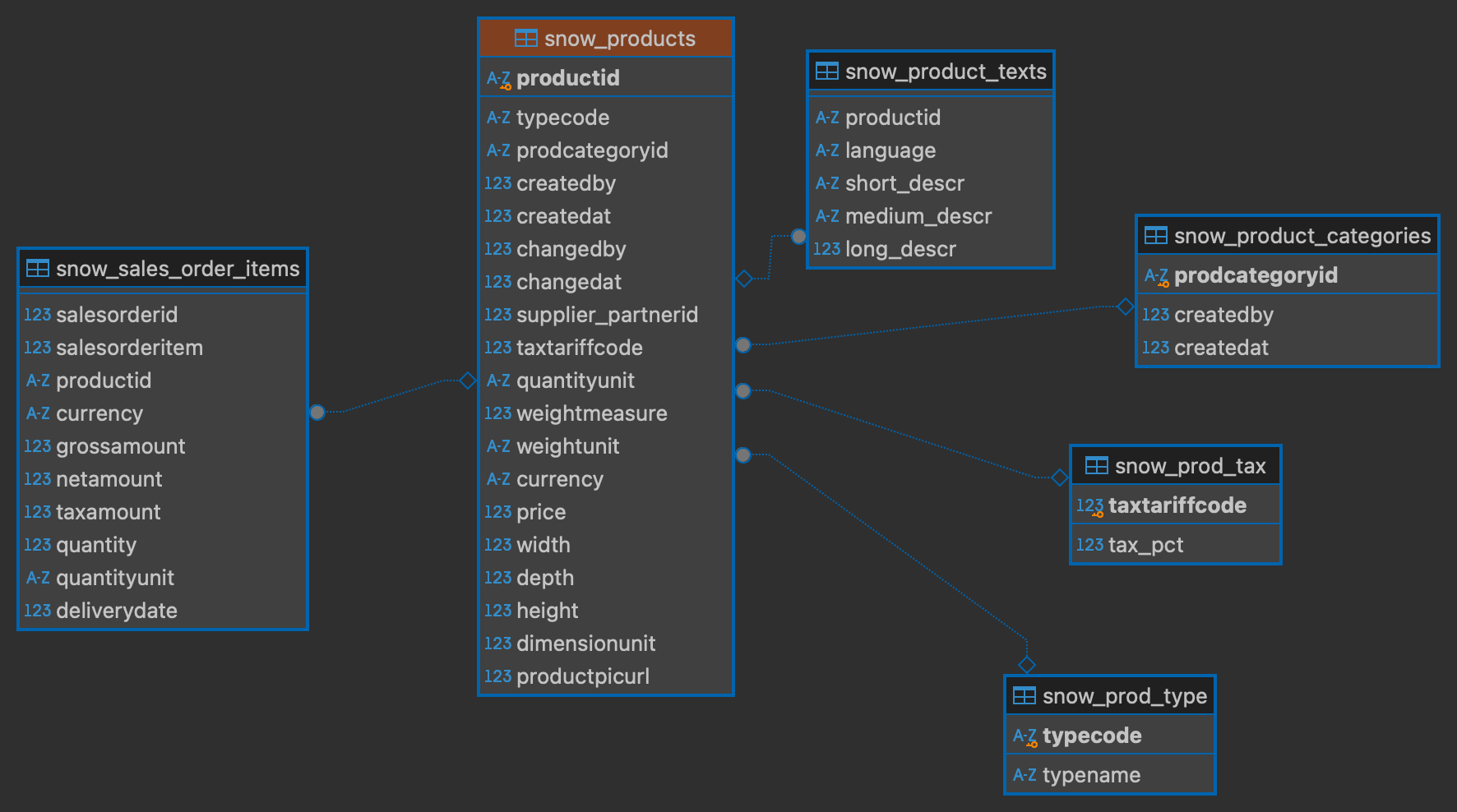 In this example we can see the fact table sales_order_items has the product table dimension and the product table has multiple smaller dimension tables.